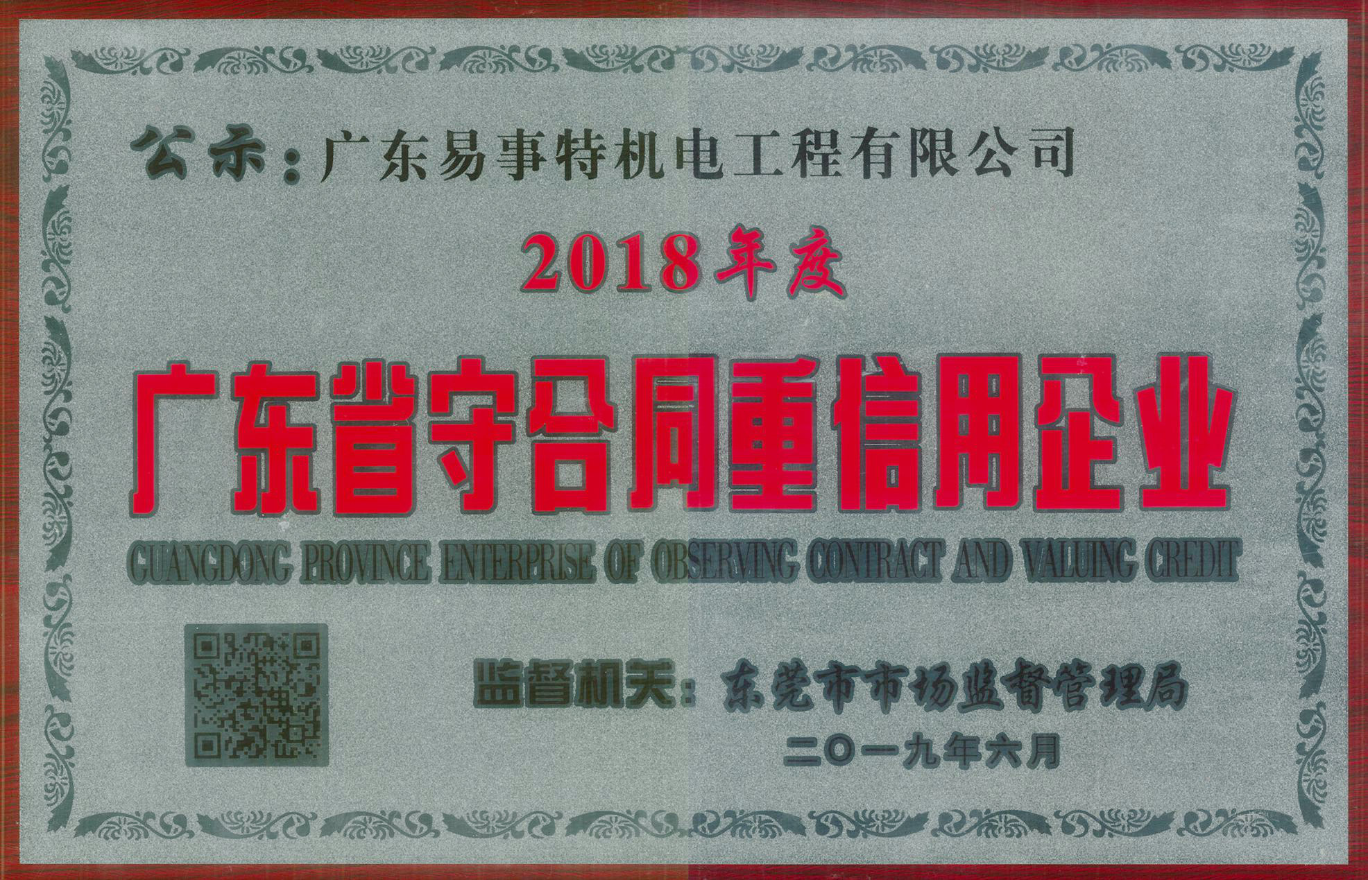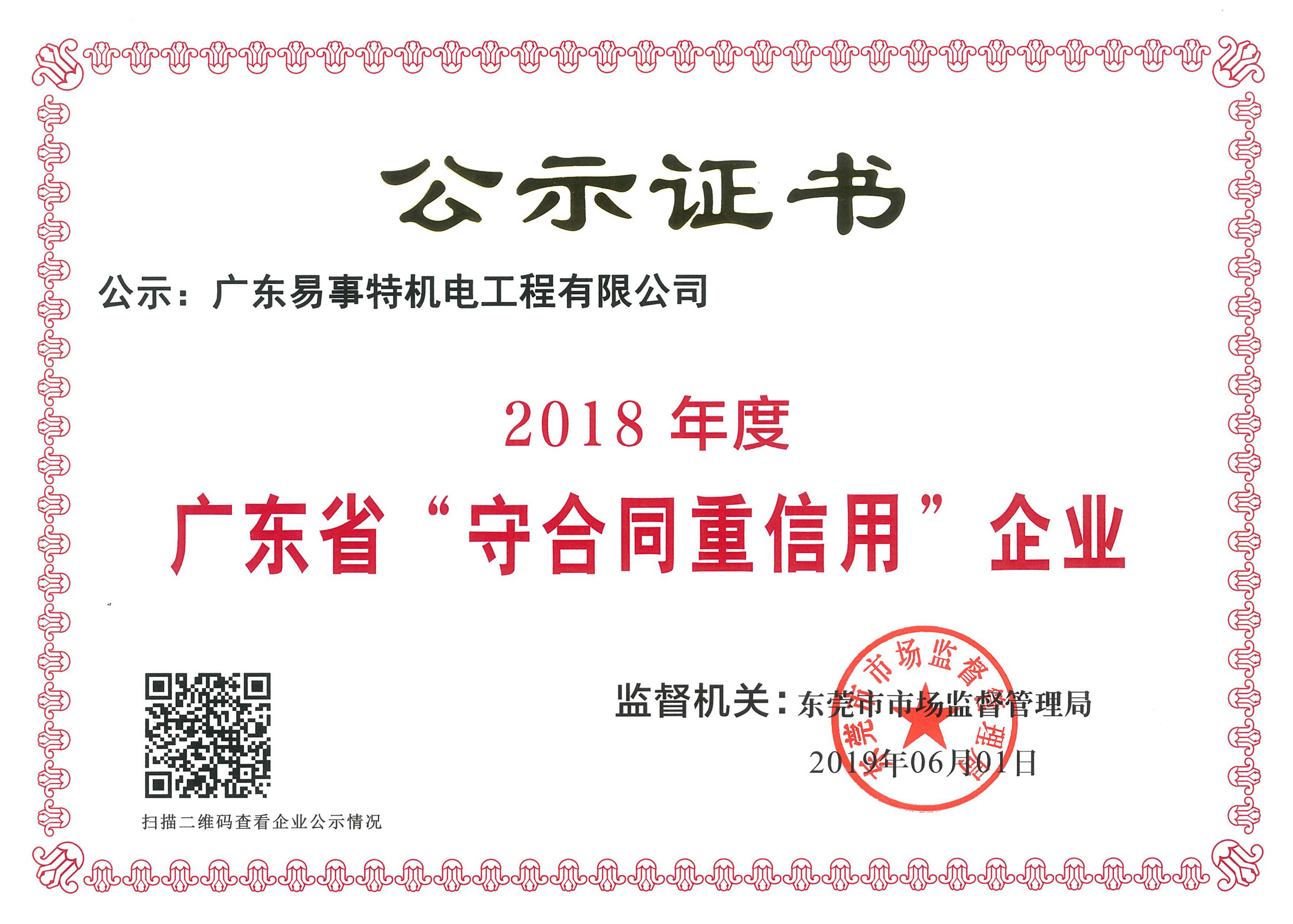 2019年6月1日,廣東易事特機(jī)電工程有限公司被東莞市市場(chǎng)監(jiān)督管理局授予 “2018年度廣東省重合同守信用企業(yè)”榮譽(yù)稱號(hào),預(yù)示著易事特機(jī)電在走向市場(chǎng)經(jīng)濟(jì)規(guī)范化,提高企業(yè)守法經(jīng)營能力,塑造企業(yè)良好信譽(yù)形象又邁上了一個(gè)新臺(tái)階。